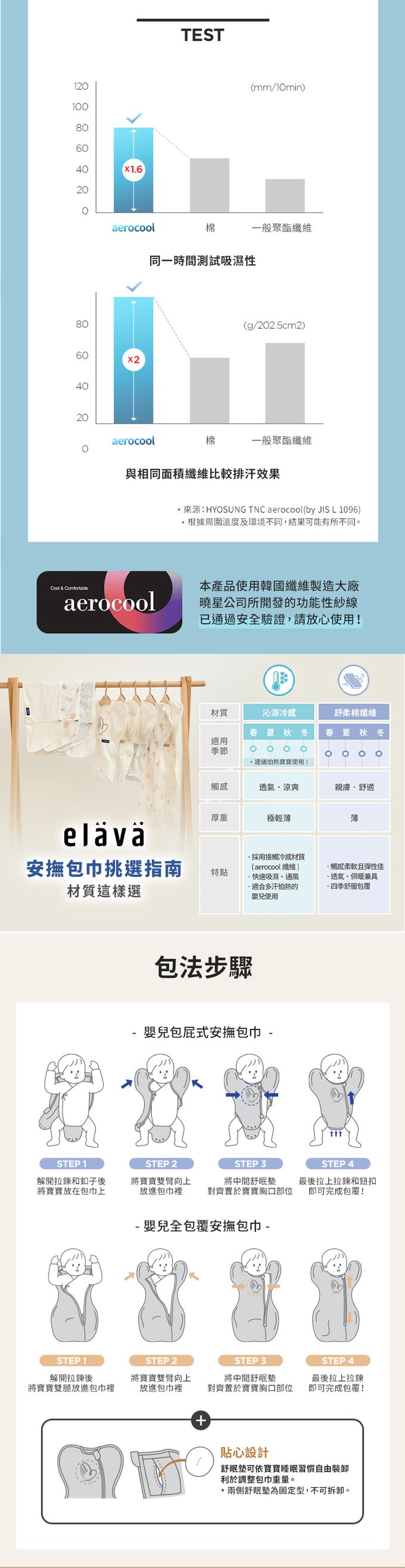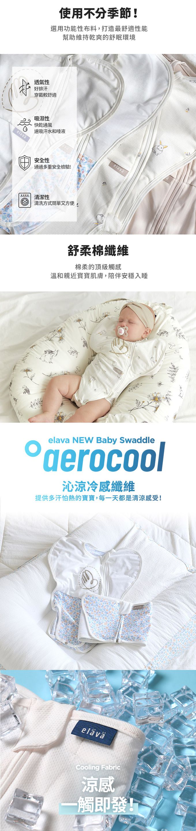 沁涼冷感材質,實測優越的吸濕、排汗效果,適合怕熱寶寶使用。