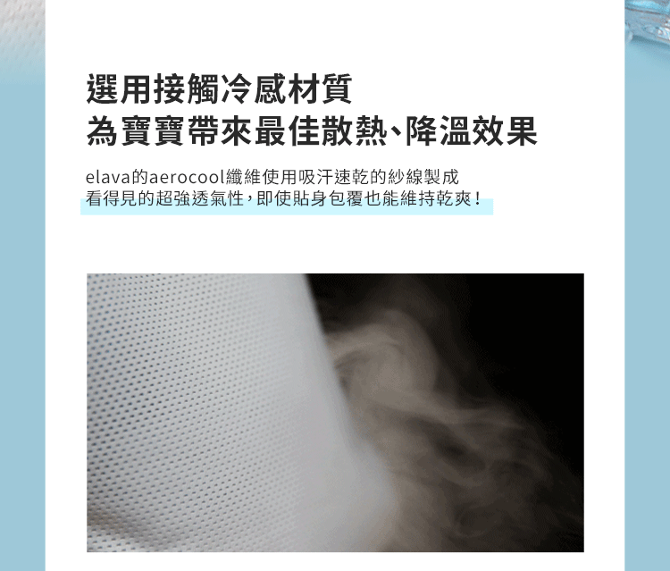 沁涼冷感材質,實測優越的吸濕、排汗效果,適合怕熱寶寶使用。
