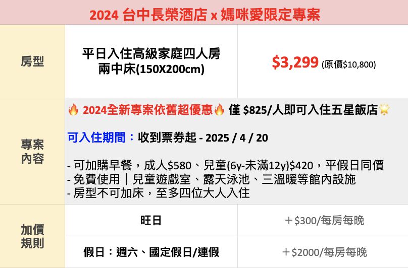 註 3:本次活動案型房間不能加床,若4位大人入住只能多加一位2歲以下的幼兒(可告知飯店需加嬰兒床)。