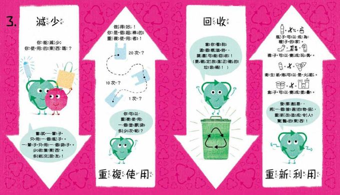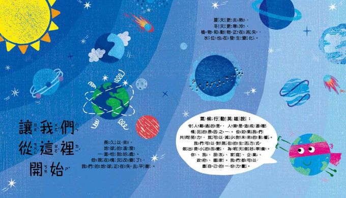 這本書以孩子們能夠理解、簡單而正向的文字,以及清楚明瞭且生動的可愛插圖,提供了一系列與「永續發展」、「愛護地球」相關,小小的、日常中就能做到的改變步驟與目標,包含「愛用在地蔬果」、「減量、再生、回收」、「節約能源」、「平等尊重」、「分享與捐獻」、「友善、合作」等13項主題,希望小讀者們可以從小建立這些永續發展概念,並共同努力在生活中實現這些目標,以期讓我們的環境產生積極的、可持續的變化。