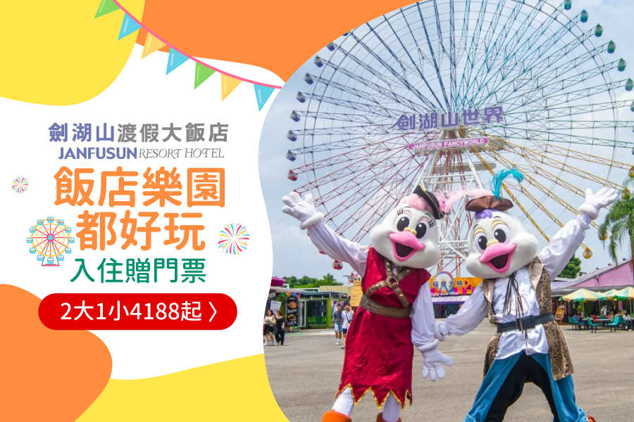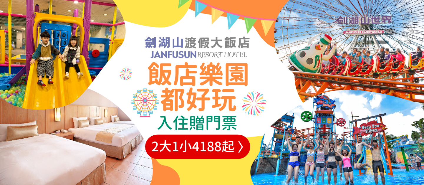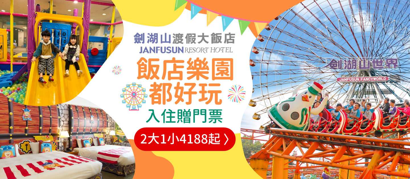 註:本專案房型不提供加床服務,每房至多入住兩大三小(12歲以下)或四大。劍湖山世界門票可於現場購買,價格依現場公告為主。