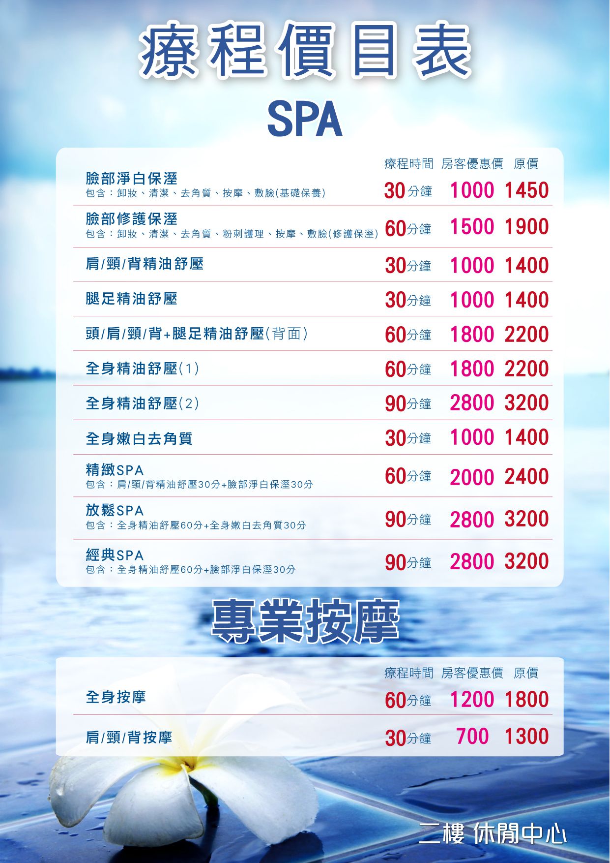 註:三溫暖付費使用每位$250,謝絕12歲以下兒童進入。SPA預約付費制,費用依照服務項目收費不同。