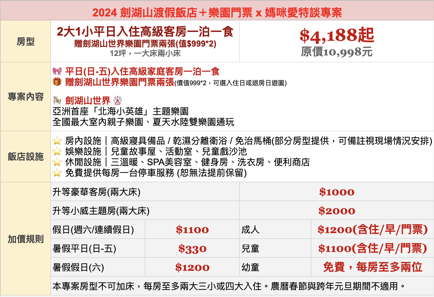 註:加人加價:幼童免費入住/入園,兒童加價$1100,大人加價$1200,以上均含住宿/早餐/門票。(門票於入住時提供)