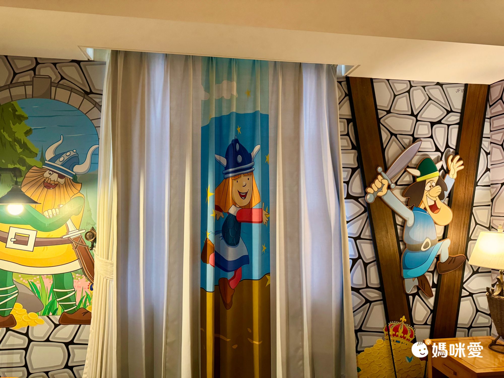 主題房總是深得孩子們的心,劍湖山渡假飯店的主體房做的很細節,不僅只有背景、牆面是北海小英雄,連檯燈、窗簾上都是。