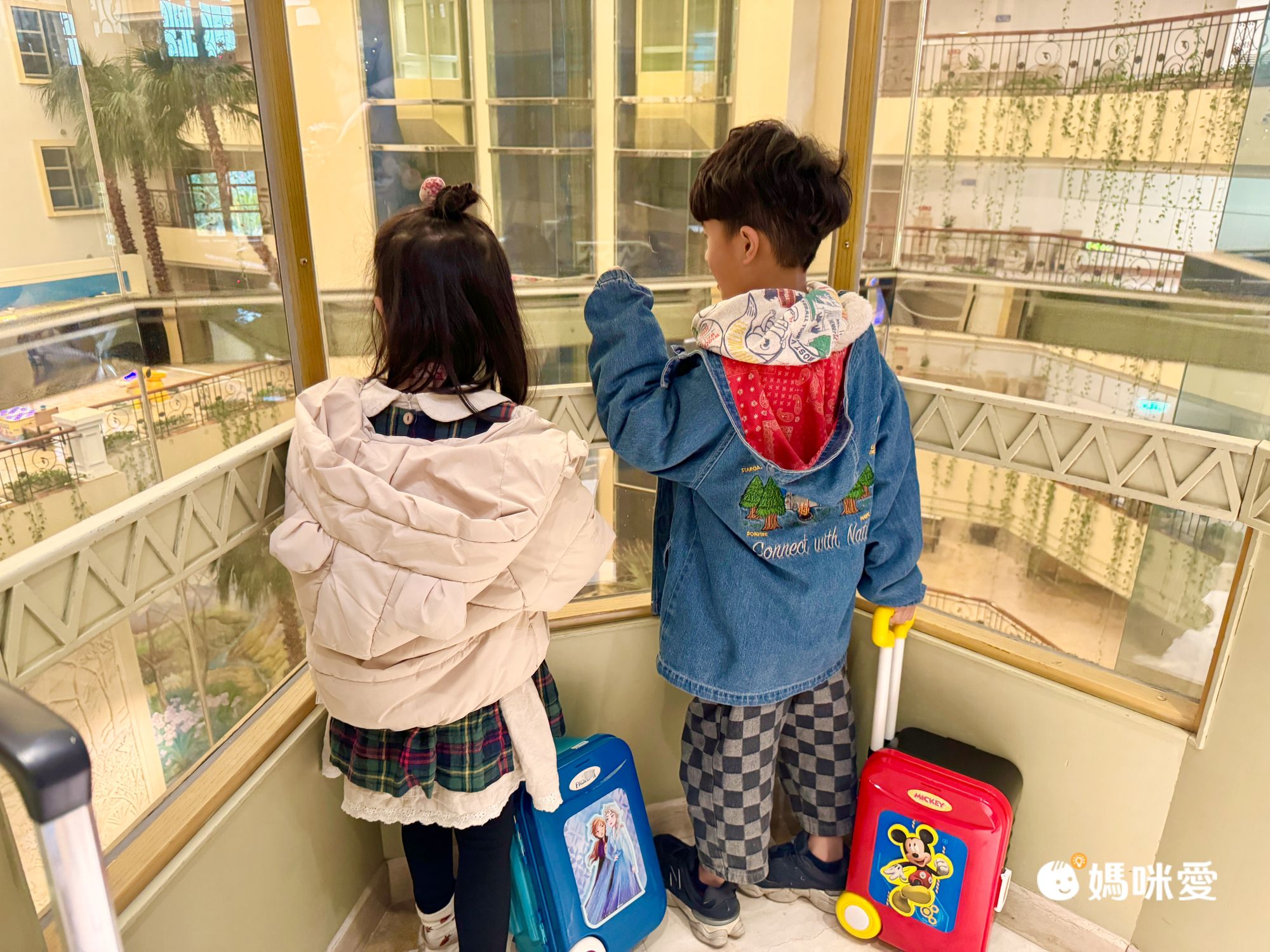 準備進房囉!孩子們都很興奮的看透明電梯外的景色