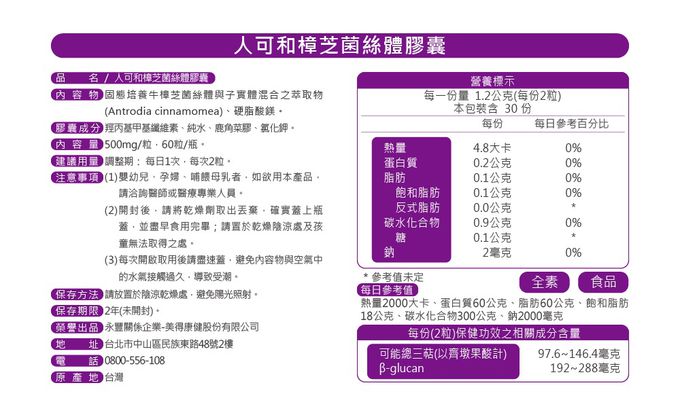 成分:固態培養牛樟芝菌絲體與子實體混合之萃取物(Antrodia cinnamomea)、硬脂酸鎂。膠囊成分 羥丙基甲基纖維素、純水、鹿角菜膠、氯化鉀
