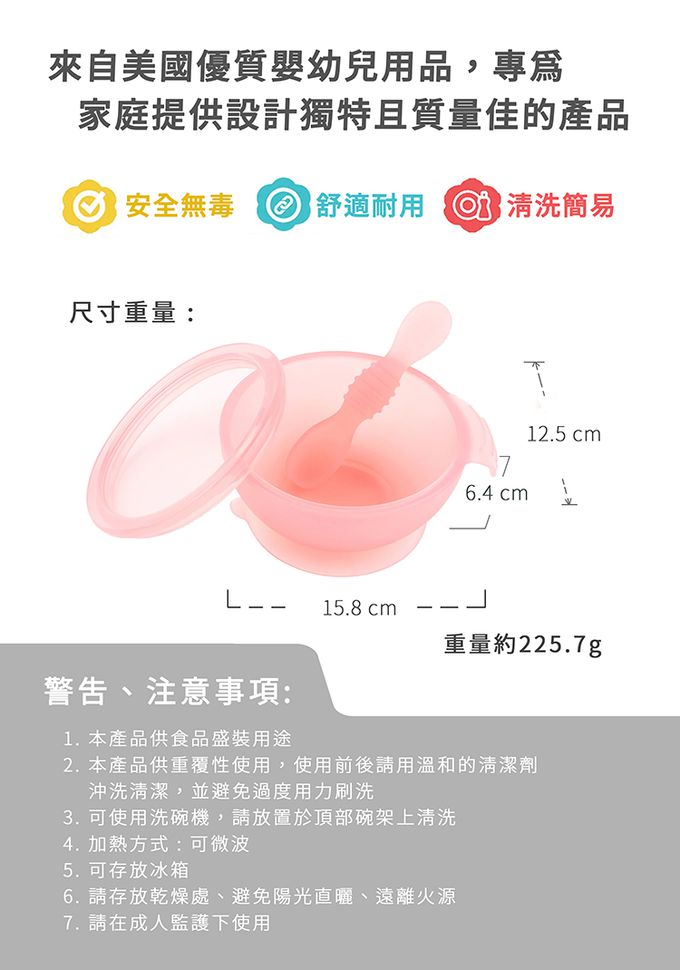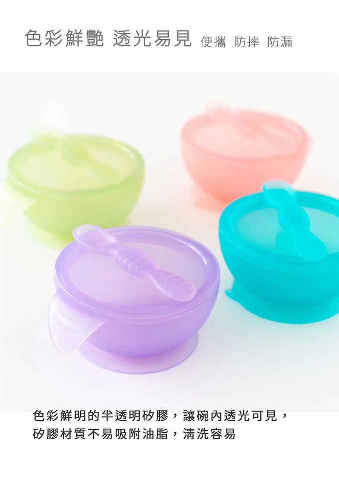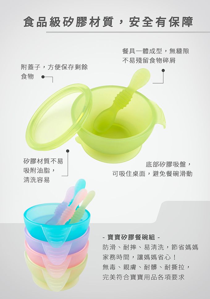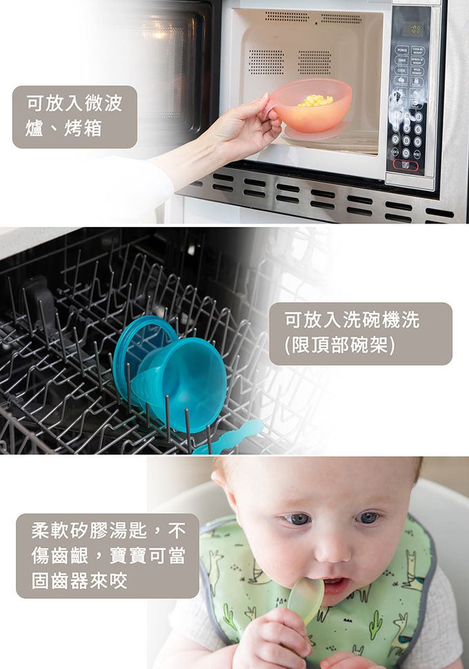 餐具一體成形,造就柔軟舒適觸感,無縫隙不易殘留食物碎屑,為辛苦的父母們省下時間。