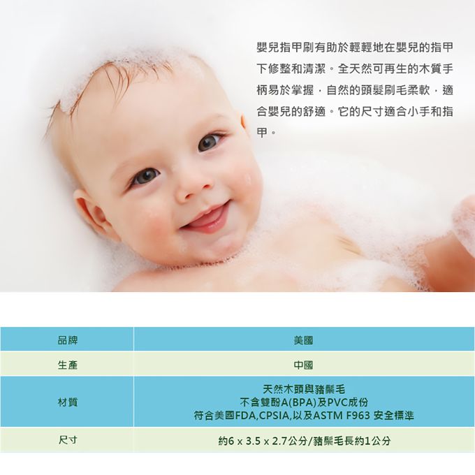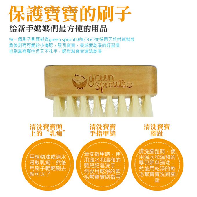 🌺 Green Sprouts 為美國知名嬰幼兒品牌,符合美國/歐洲各項食品/用品安全機構嚴格標準測試,努力致力於提供嬰幼兒安全、健康、高品質用品🌺 超優質材質:天然木頭、豬鬃毛 🌺 適合寶寶小手和指甲🌺 柔軟的刷毛,適合寶寶🌺 指甲刷有助於寶寶的指甲清潔🌺 不含雙酚A(BPA)、無PVC成分