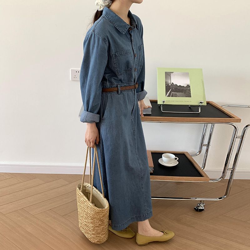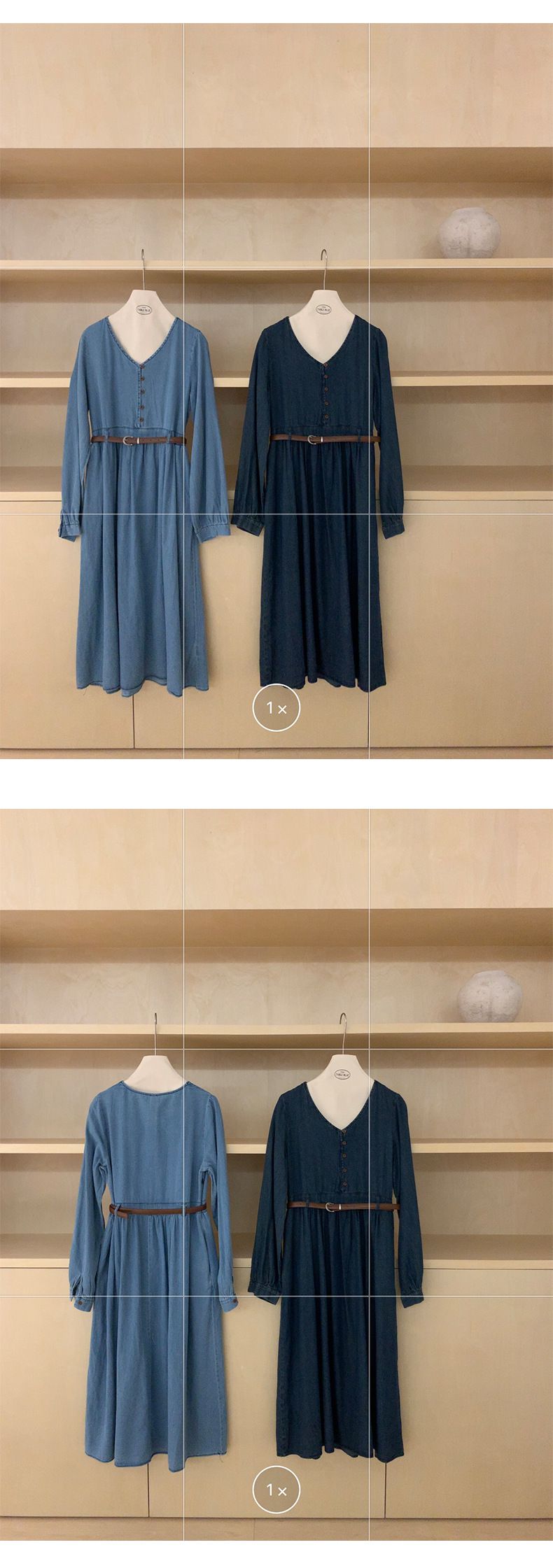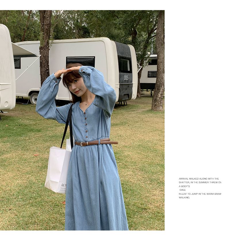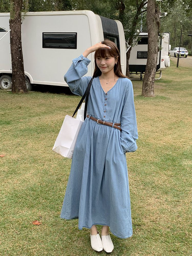 休閒顯瘦V領牛仔長洋裝-淺藍色 (F)