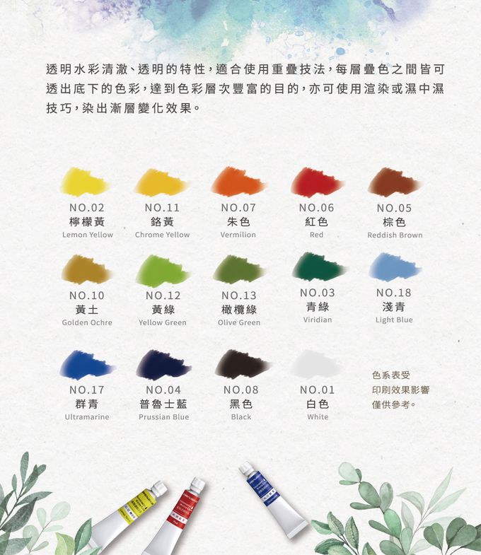 透明水彩清澈、透明的特性,適合使用重疊技法,每層疊色之間皆可透出底下的色彩,達到色彩層次豐富的目的,亦可使用渲染或濕中濕技巧,染出漸層變化效果。透明水彩充滿趣味和靈活性,可以呈現多種效果,包括柔和、清新、自然、繽紛、深邃以及華麗的視覺效果。無論是剛剛開始嘗試畫畫,還是經驗豐富的老手,透明水彩都能夠滿足多樣技法創作需求。色彩豐富、渲染效果出色、透明性好,透明水彩是許多設計學院學生、藝術家展現創意的優先選擇。