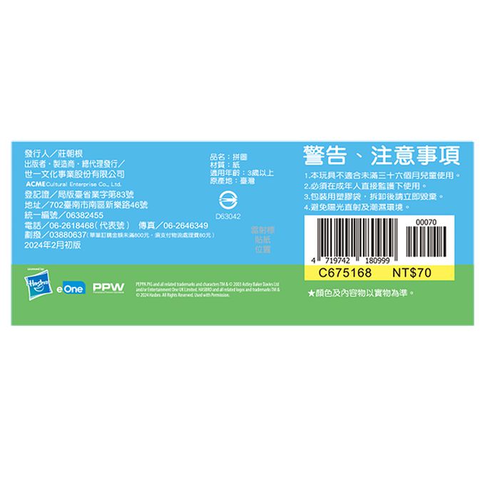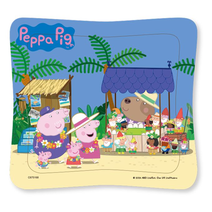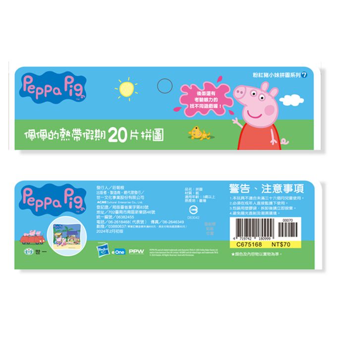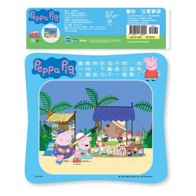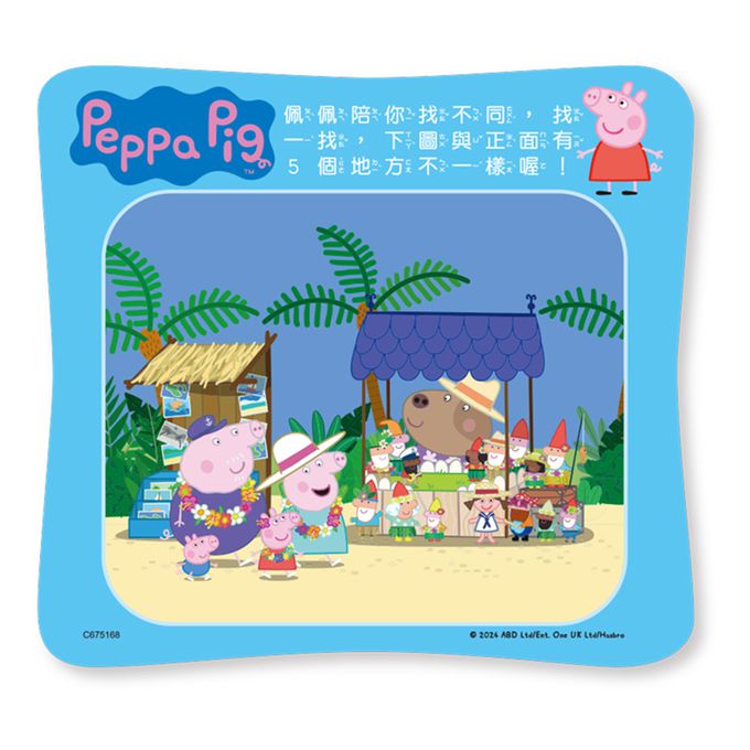 粉紅豬小妹佩佩是一隻很可愛但是有點愛指揮別人的4歲小豬,他和爸爸豬、媽 媽豬還有弟弟喬治每天都開心的生活在一起。粉紅豬小妹這次要和弟弟喬治還有爺爺奶奶一起去熱帶島嶼玩,除了拼湊出享受熱帶假期的佩佩們,背面還有找一找,玩拼圖+找一找,正面反面都好玩。讓最有吸引力的粉紅豬小妹陪伴孩子在拼圖組合過程中學習部分與整體概念、手眼協調、專注力、觀察力及自我獨立完成的能力,開發各種潛能吧!