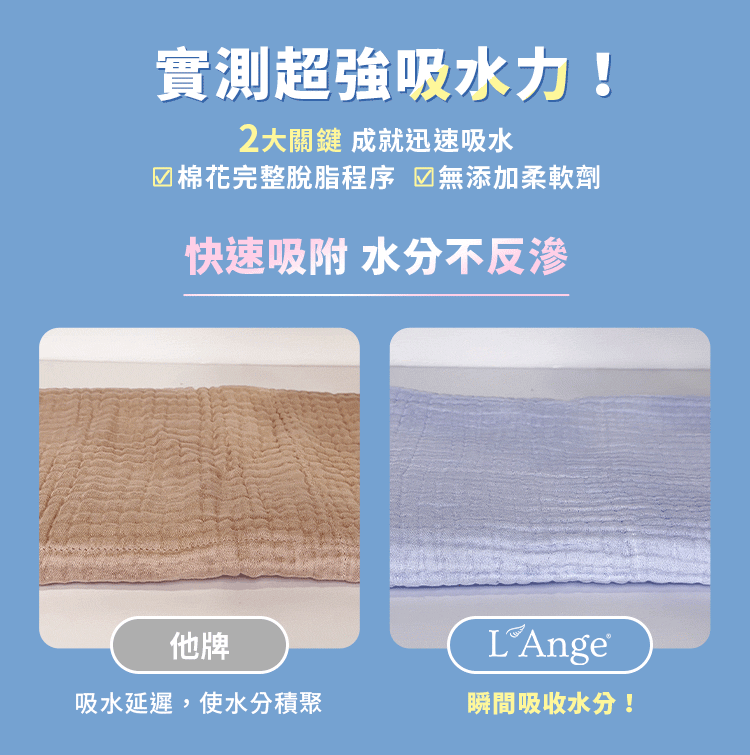 嚴選棉花及脫脂程序,縱橫交錯編織而成,透氣、快乾且吸水性極佳!可快速帶走多餘水分。