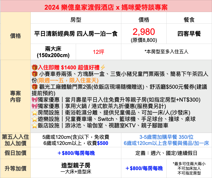 註:如欲升等造型親子房(不指定房型),可加價800/每房每晚,如需指定房型可加價+NT$300。親子房型至多可入住兩大兩小。