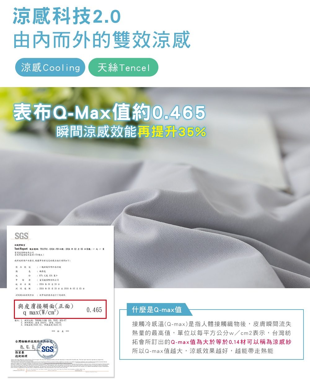 • 材質:表布-涼感紗(87%錦綸+13%氨綸)/填充物-30%天絲棉+70%聚酯纖維