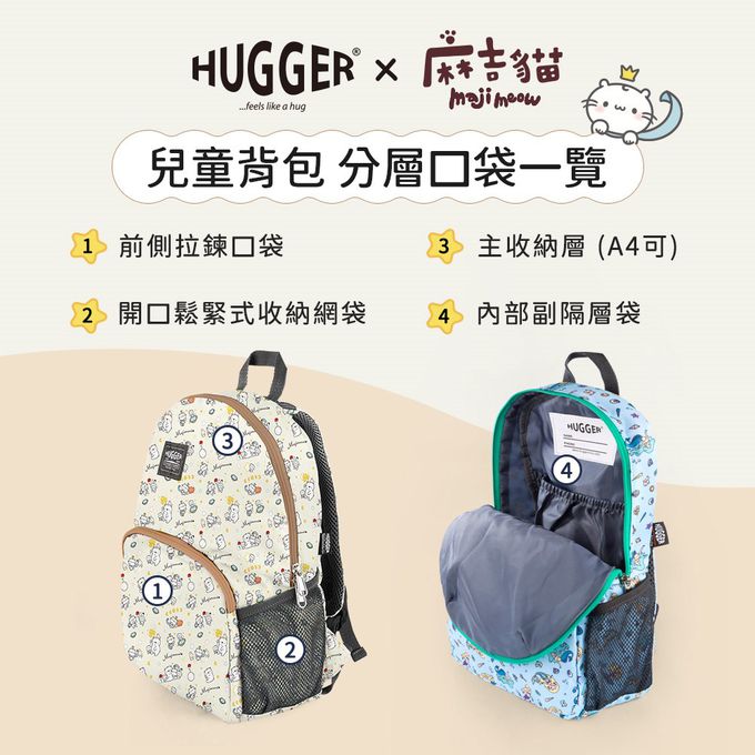 HUGGER x 麻吉貓兒童背包不僅是一款實用的背包,更是孩子們的快樂源泉,讓他們的每一步都跟隨著麻吉貓的慵懶足跡,開啟一場場充滿想像的冒險。