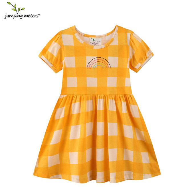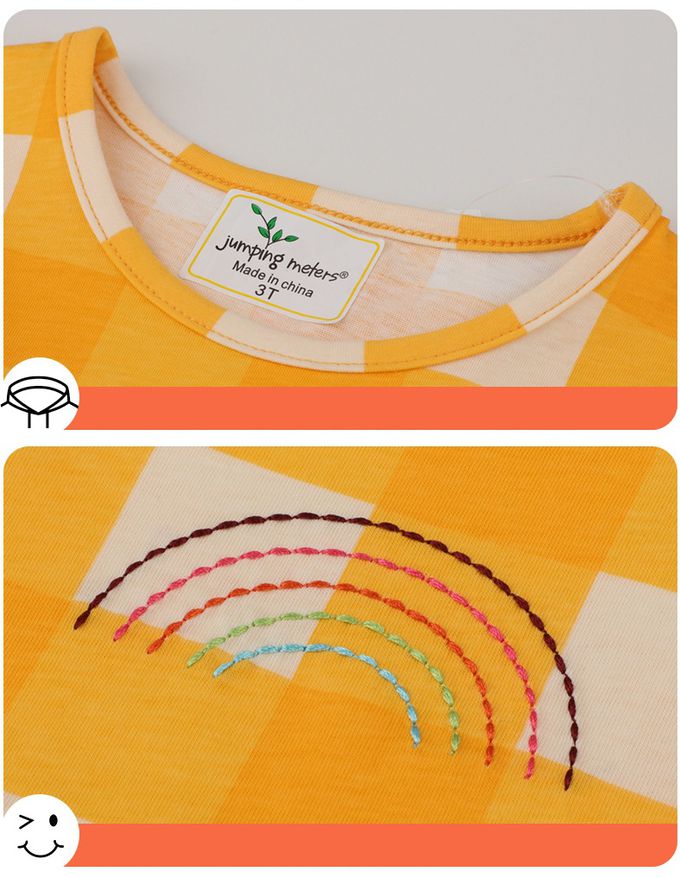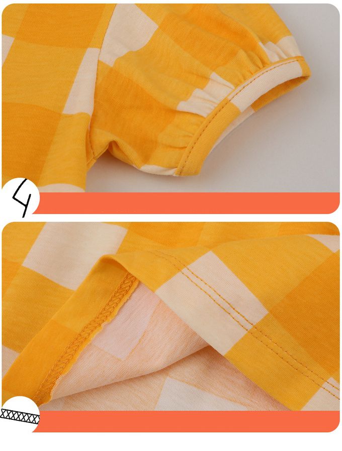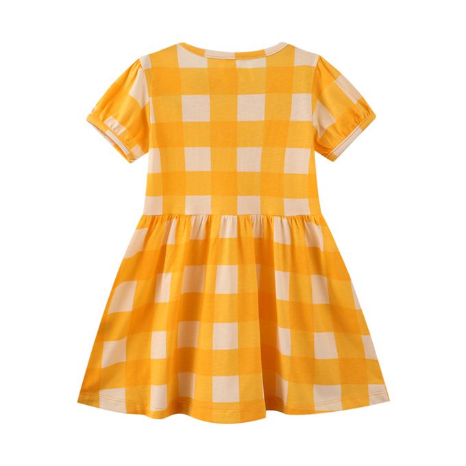 棉質圓領短袖洋裝-彩虹刺繡-黃色格紋