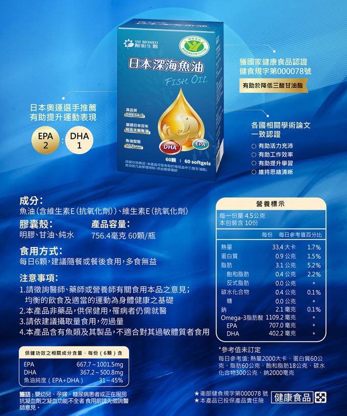 注意事項:1.請徵詢醫師、藥師或營養師有關食用本品之意見;均衡的飲食及適當的運動為身體健康之基礎 2.本產品非藥品,供保健用,罹病者仍需就醫 3.請依建議攝取量食用,勿過量 4.本產品含有魚類及其製品,不適合對其過敏體質者食用