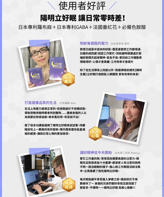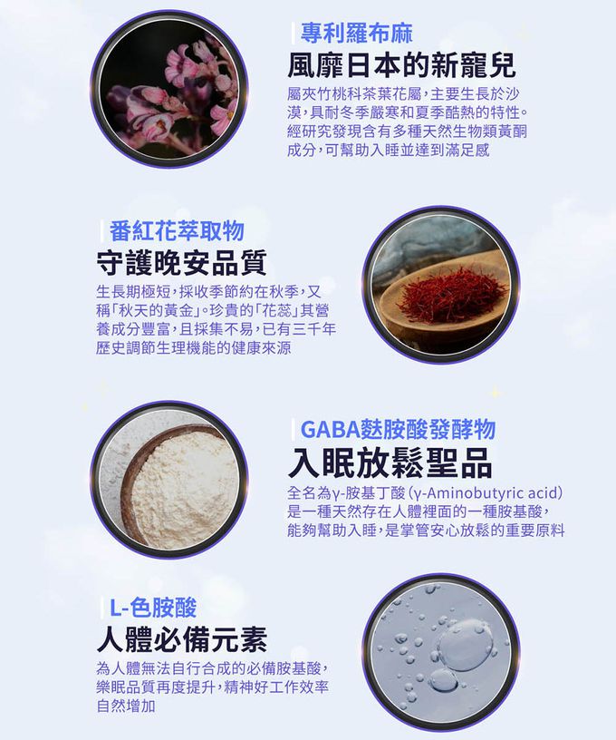 成分: L-色胺酸、麩胺酸發酵物[氧化澱粉、麩胺酸發酵物(含GABA)]、海藻鈣、啤酒酵母粉(含維生素B1、