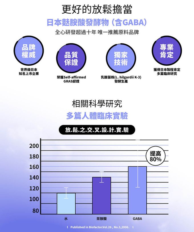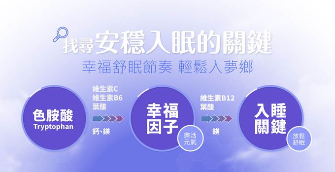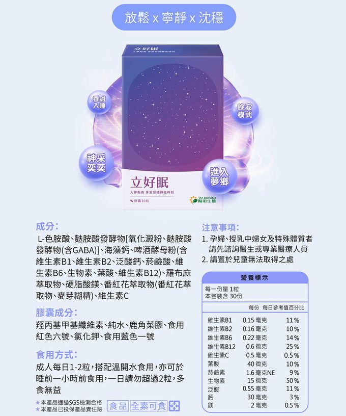 成分: L-色胺酸、麩胺酸發酵物[氧化澱粉、麩胺酸發酵物(含GABA)]、海藻鈣、啤酒酵母粉(含維生素B1、