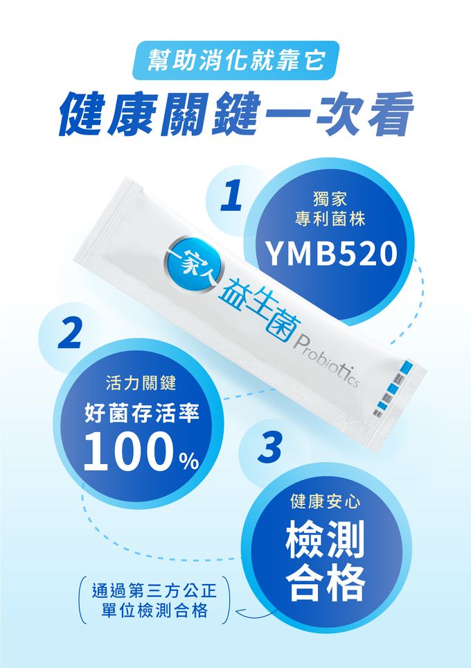 異麥芽寡糖、麥芽糊精、玉米澱粉、陽明專利益生菌YMB520(納豆菌)、卡姆果萃取(含維生素C)、酵母鋅、菊苣纖維、β-胡蘿蔔素(含維生素A)、
