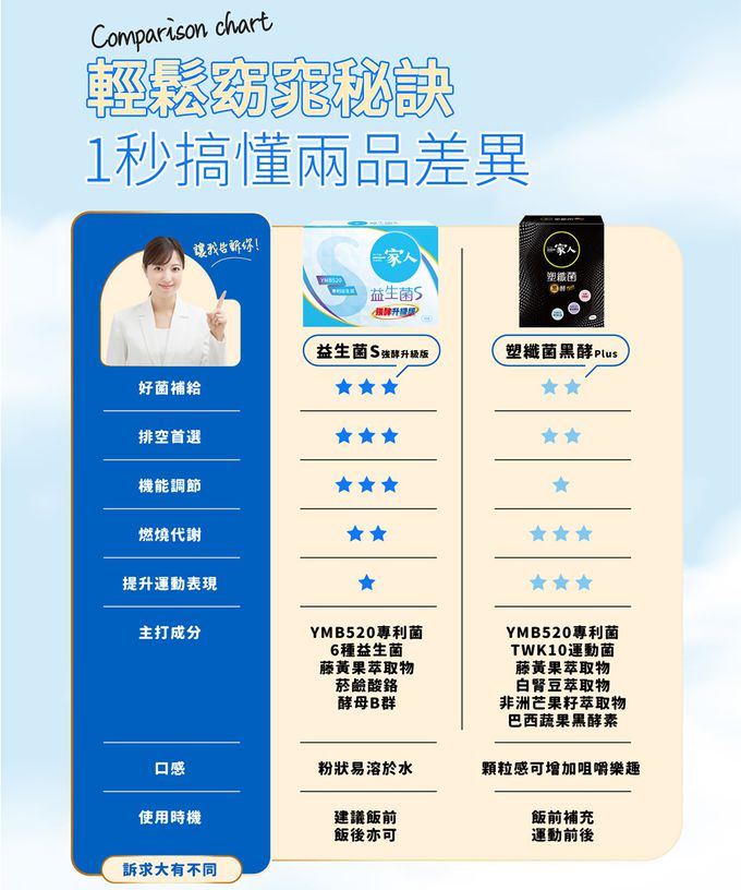 成分:乳糖、優格粉(砂糖、脫脂奶粉、麥芽糊精、全脂奶粉、葡萄糖、檸檬酸、酵母提取物、香料、 脂肪酸甘油酯(植物性)、二氧化矽)、異麥芽寡糖、異麥芽酮糖醇、Fibryxa專利纖維(異麥芽糊精)、 卡姆果萃取(含維生素C)、玉米澱粉、Super Citrimax專利超級藤黃果、啤酒酵母、酵母粉(含維生素B群)、 菊苣纖維、嗜酸乳桿菌、洛德乳桿菌、乳酸雙歧桿菌、鼠李糖乳桿菌、副乾酪乳桿菌、長雙歧桿菌、 陽明專利益生菌YMB520(納豆菌)、酵母鋅、維生素E、β-胡蘿蔔素、ChromeMate專利菸鹼酸鉻