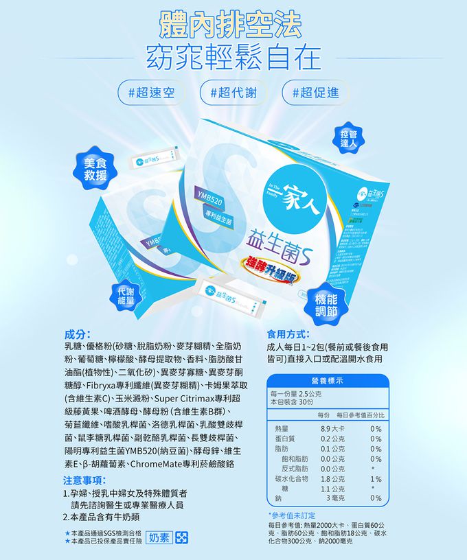 商品重(容)量:一家人益生菌S 30入x2盒 +10入x3盒, 共90包