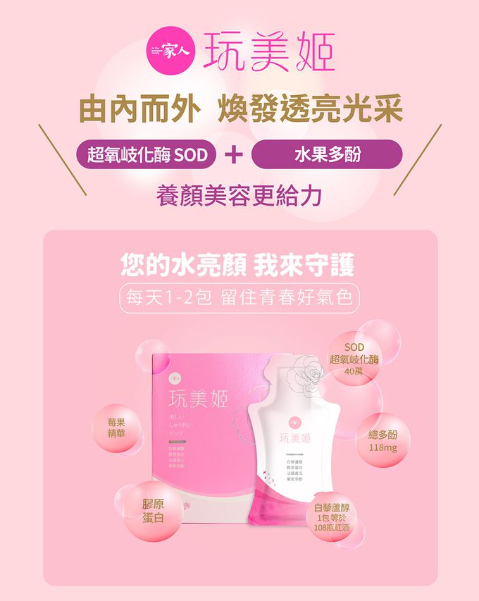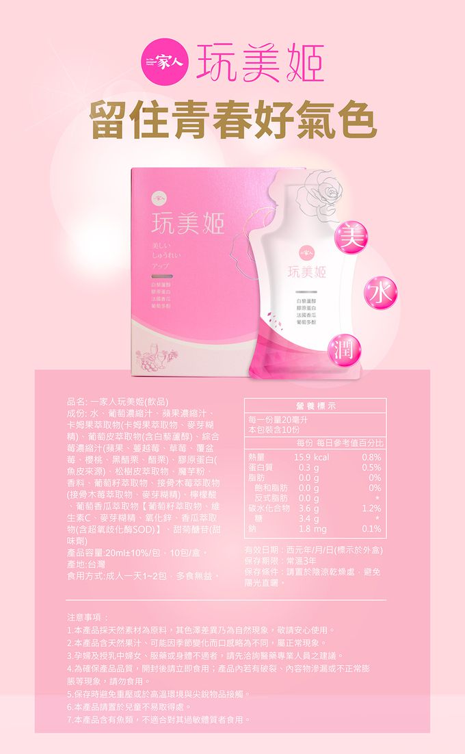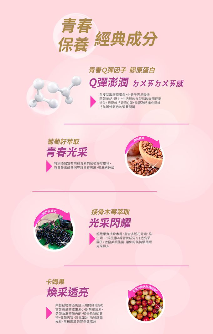 成分 : 水、葡萄濃縮汁、蘋果濃縮汁、卡姆果萃取物(卡姆果萃取物、麥芽糊精)、葡萄皮萃取物(含白藜蘆醇)、綜合莓濃縮汁(蘋果、蔓越莓、草莓、覆盆莓、櫻桃、黑醋栗、醋栗)、膠原蛋白(魚皮來源)、