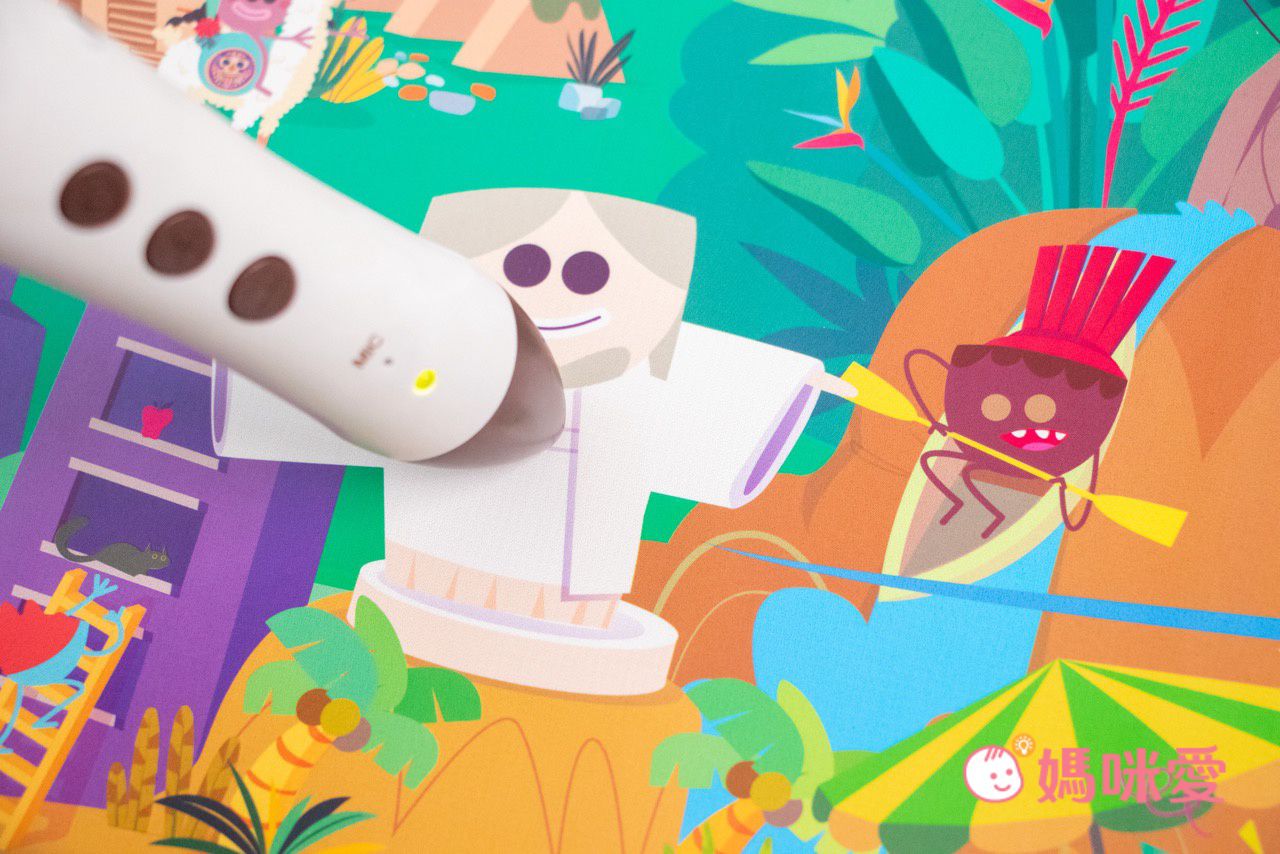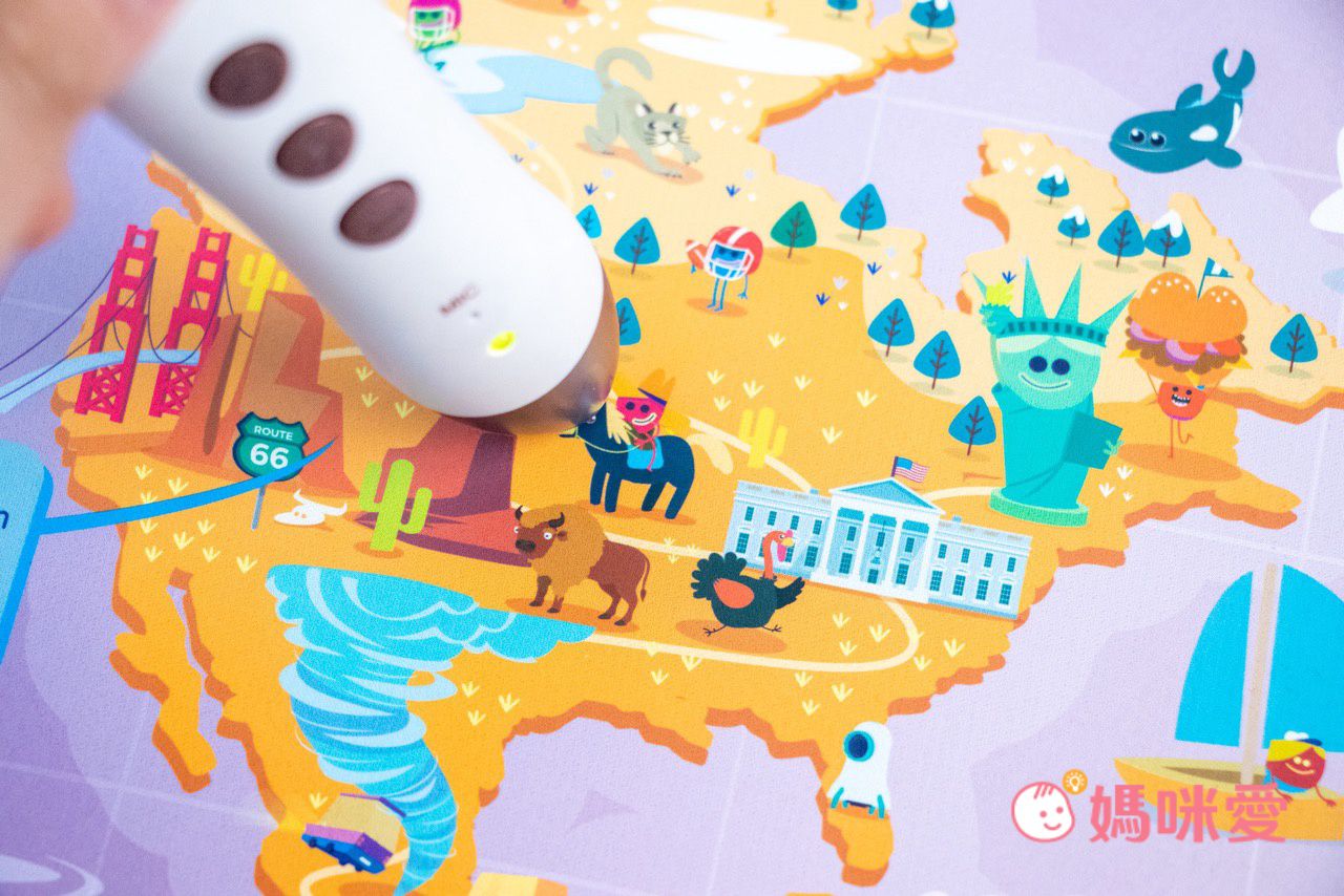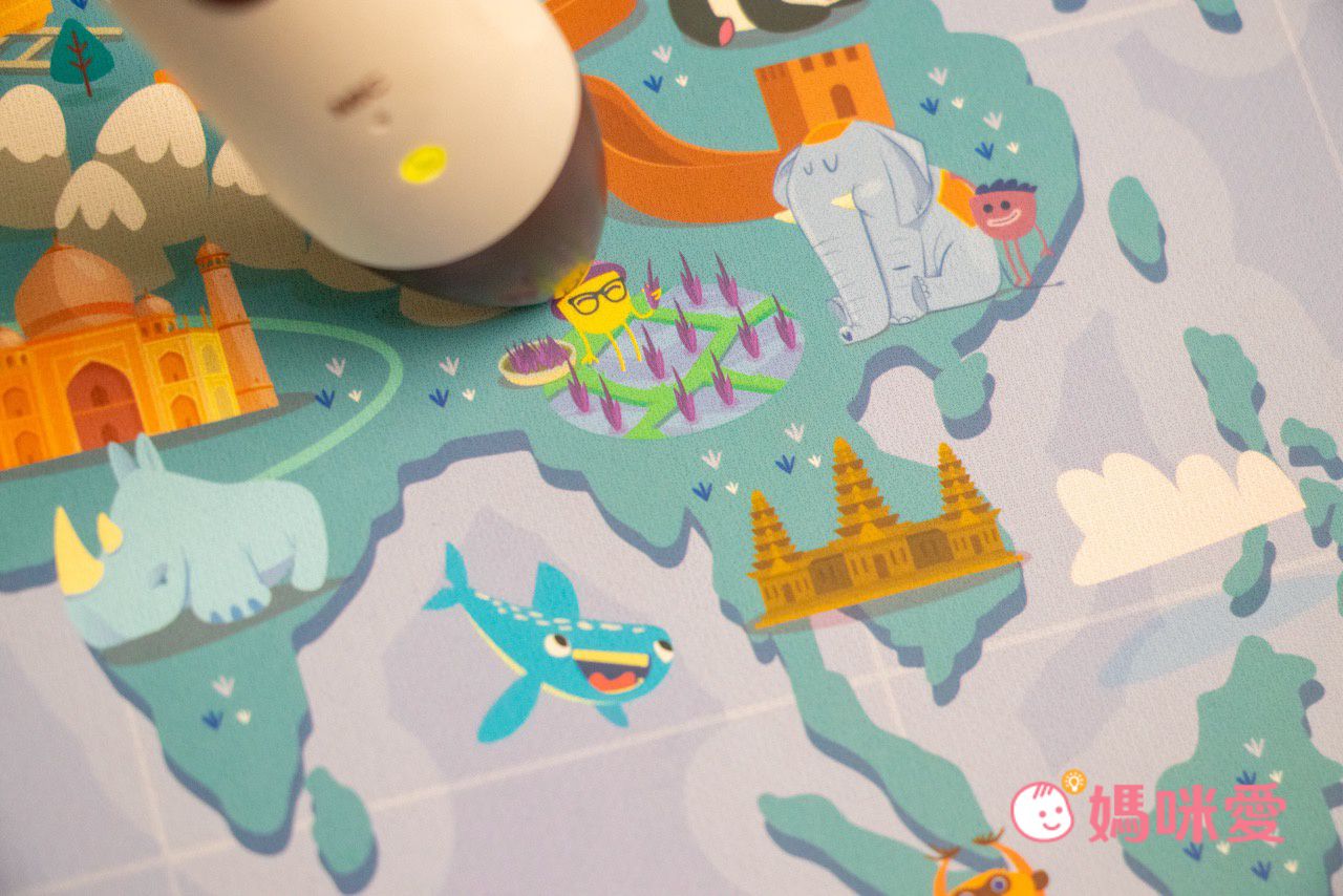 地球儀上有像是埃及金字塔、泰姬瑪哈陵、喜馬拉雅山、駱駝、俄羅斯娃娃⋯等圖案,搭配點讀,讓小若可以清楚知道世界各個地方有著不同的地景地貌、代表動物、著名地標、文化特色等知識。