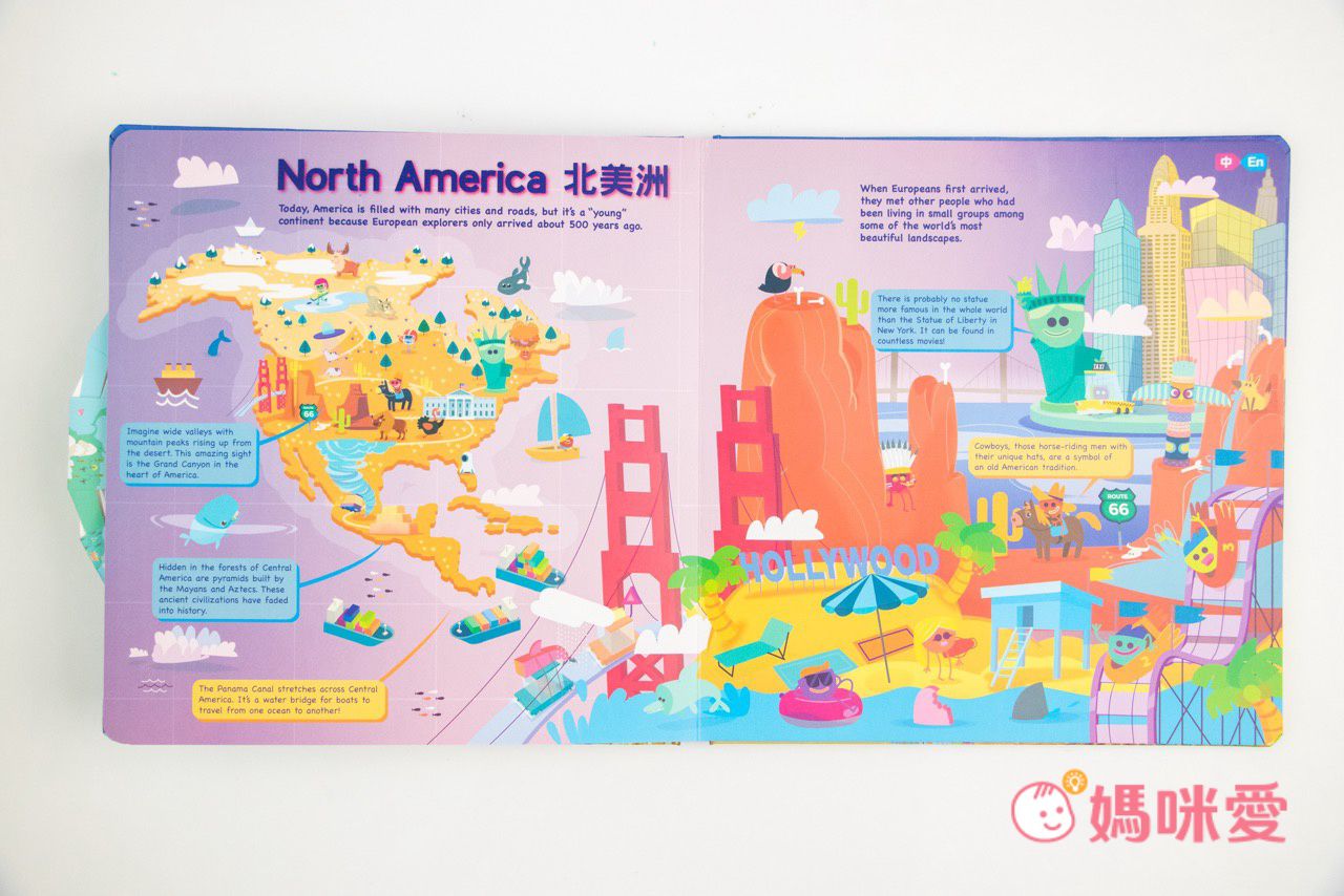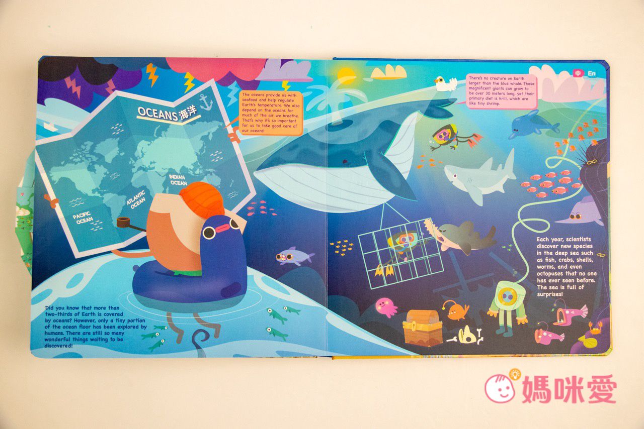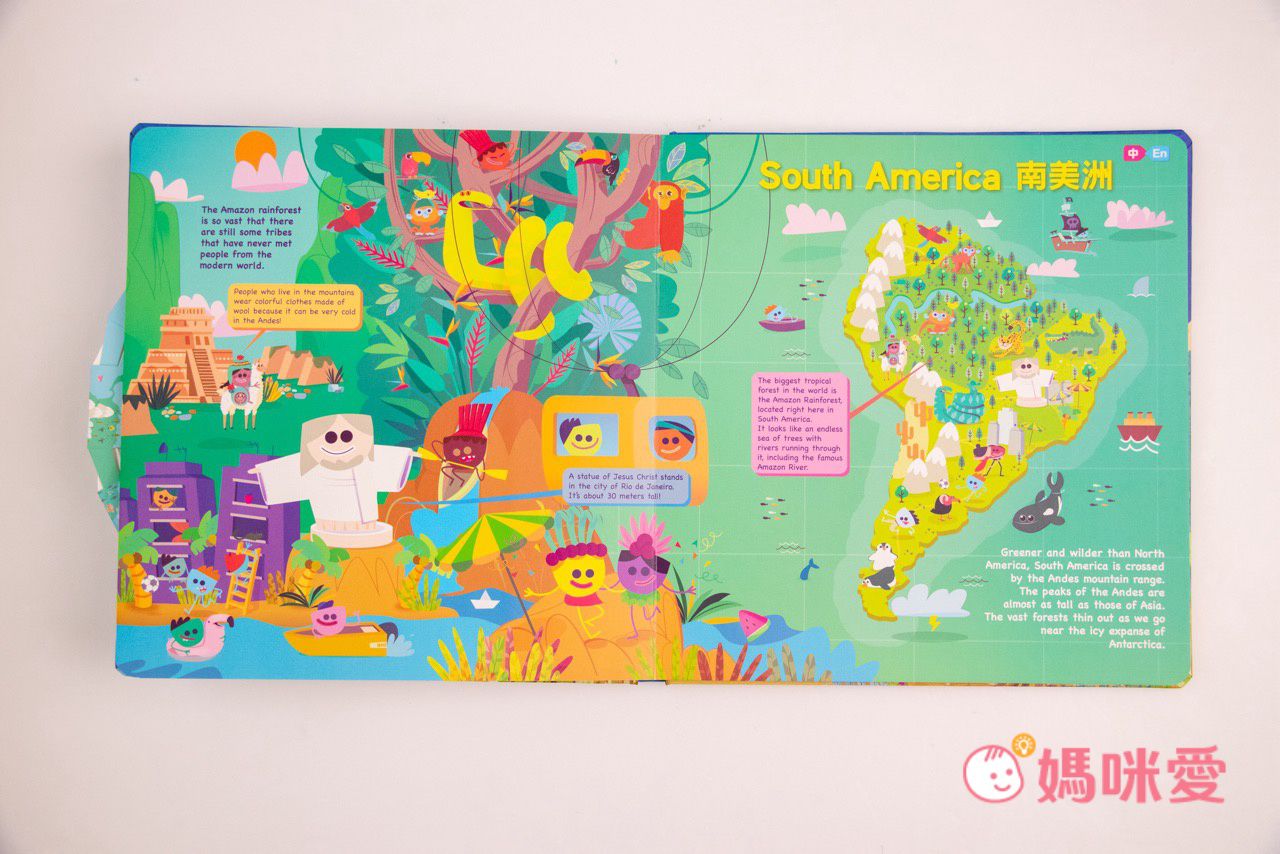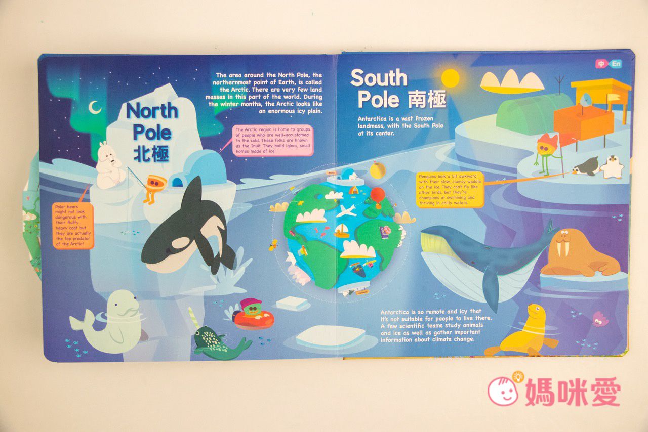 這本真的是我目前看過最炫的地理概念啟蒙點讀教材。無論是吸睛的地球儀、內容豐富(涵蓋外太空到地球、五大洲到南北極)、中英雙語(雙倍學習效益),都令媽咪嘖嘖稱奇!一定要收藏~