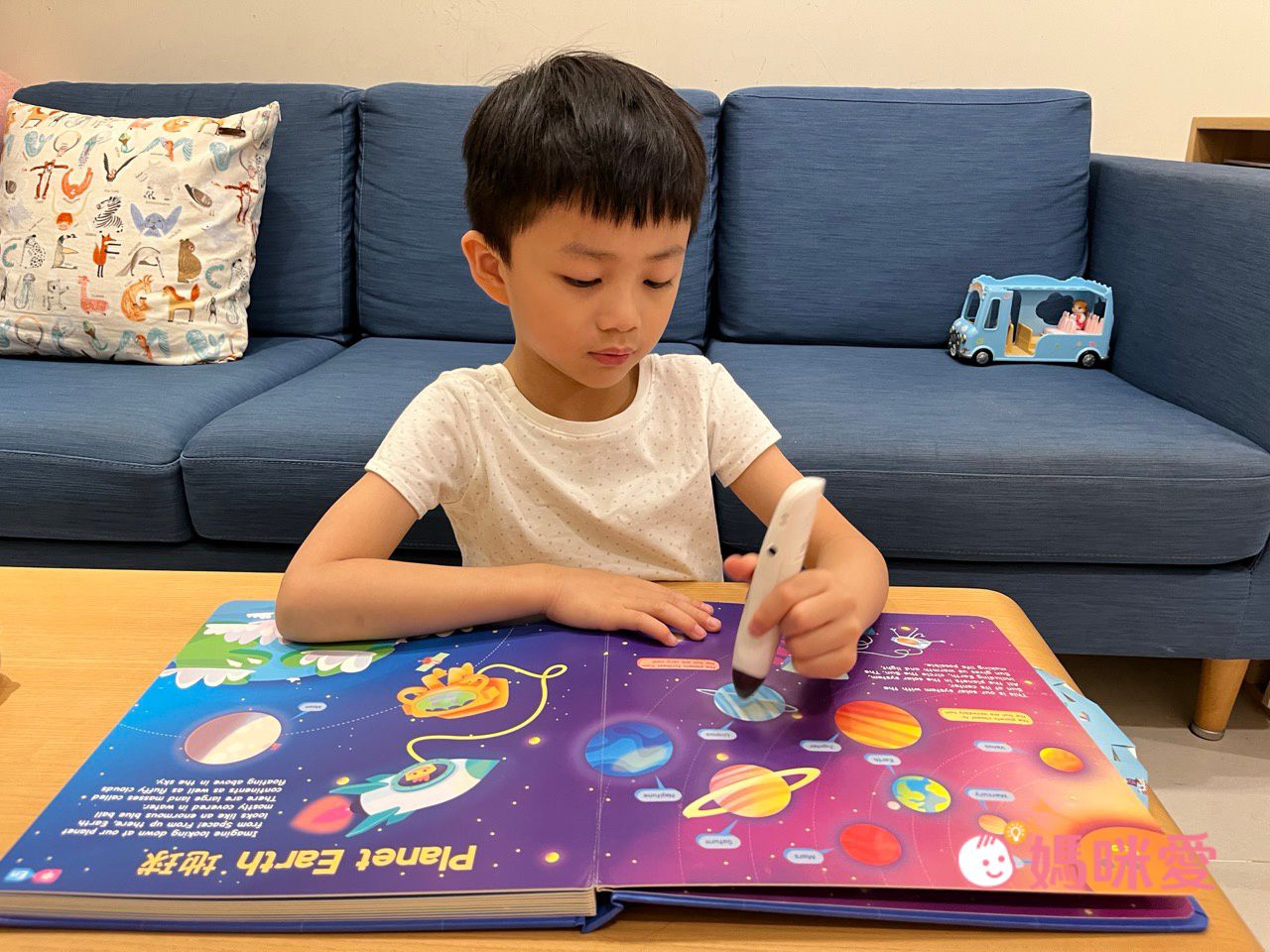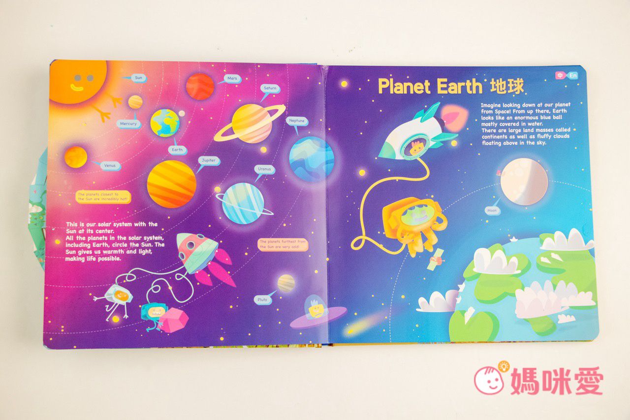 讓孩子看看地球在行星中的位置、對太空有了初步了解。雖然小若不是第一次看到行星介紹,但是書中可愛的插圖、配色和精彩聲音,都讓他聽故事聽得津津有味!