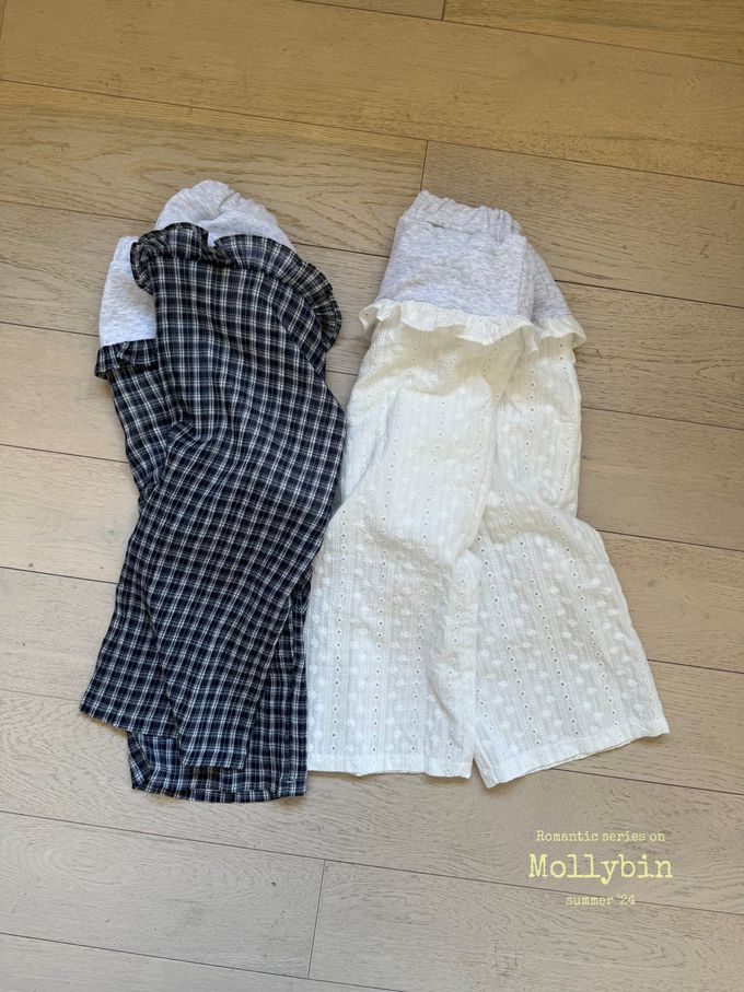 韓國 Mollybin - 鬆緊腰拼接格紋布寬鬆長褲-黑
