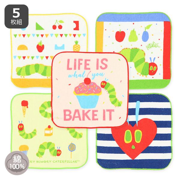 日本西松屋 - 純棉上學擦手巾/手帕(5入組)-好餓的毛毛蟲-蛋糕款 (16×16cm)