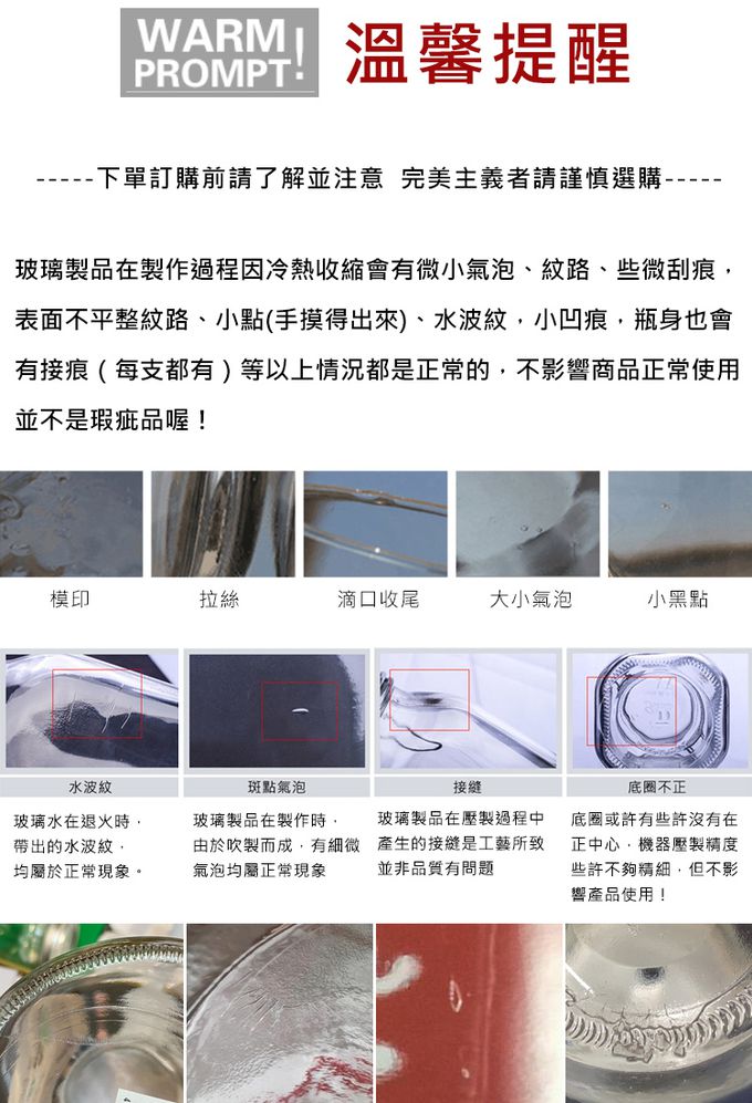*玻璃製品在製作過程因冷熱收縮會有微小氣泡、紋路、些微刮痕,表面不平整紋路、小點(手摸得出來)、水波紋,小凹痕,瓶身也會有接痕(每支都有)等以上情況都是正常的,不影響商品正常使用並不是瑕疵品喔!