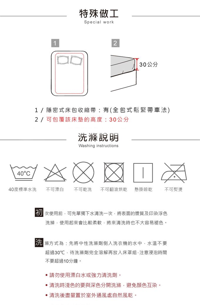 可水洗/不可乾洗/不可漂白/不可烘乾/可蒸氣熨燙