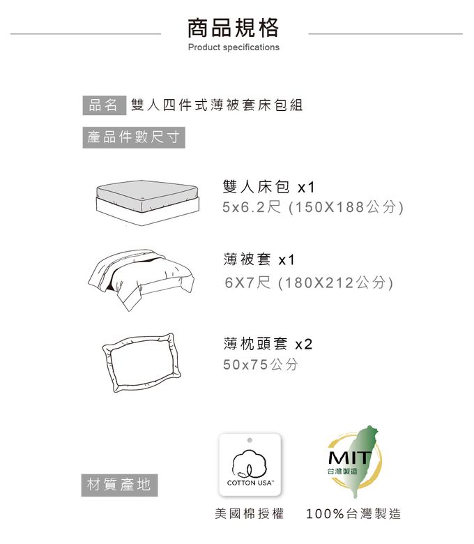 內容物:床包 1 件 + 薄被套1 件 + 枕頭套 2 件