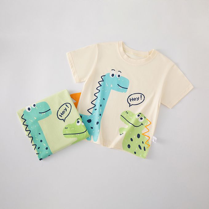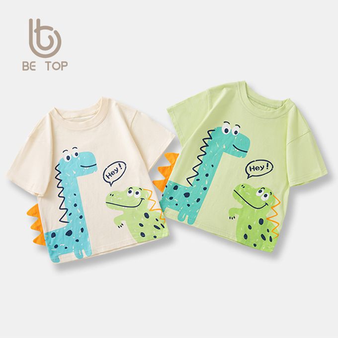 BE TOP - 純棉短袖上衣-可愛恐龍-黃藍拼袖