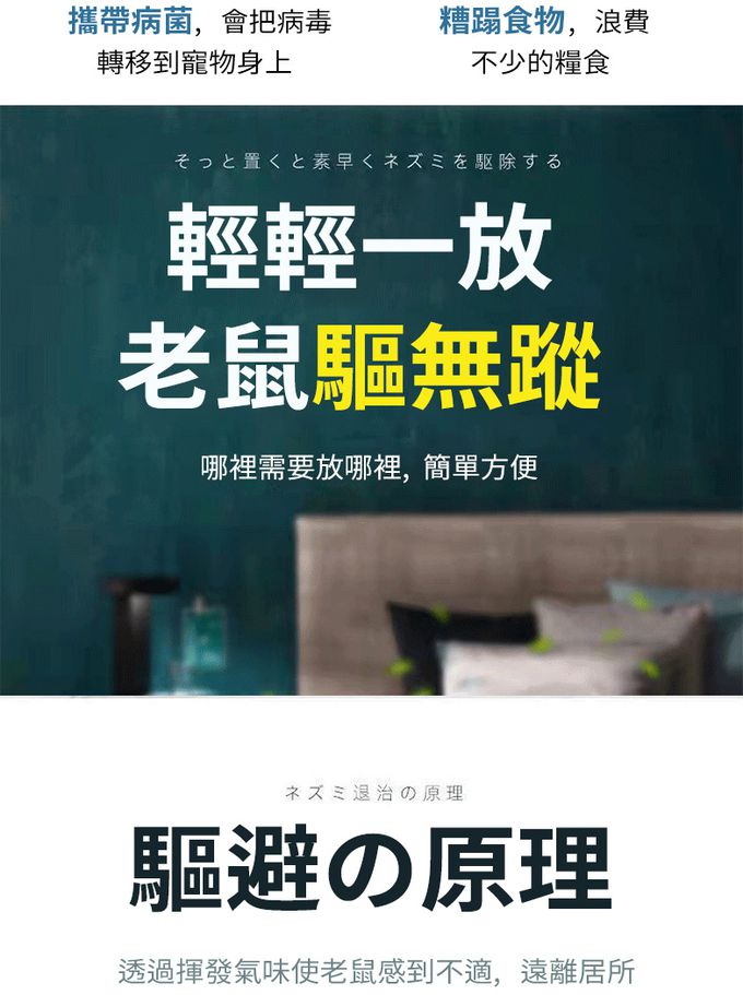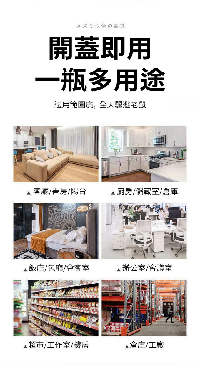 使用前請確認封口膜有完全取下,再蓋上塑膠蓋放置即可有效達到避免及驅趕老鼠功效