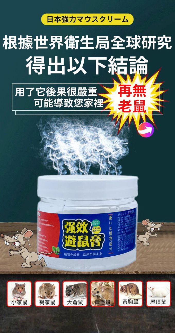 驅鼠膏主要成分是辣椒油及薄荷油的萃取,膏狀類型的內容物人體直接聞的氣味不會很明顯,是針對老鼠敏感的嗅覺設計,透過緩效氣味揮發的方式使老鼠感到不適及焦躁不安、進而逃離,長時間擺放後會使其形成慣性並漸漸遠離擺放地點。