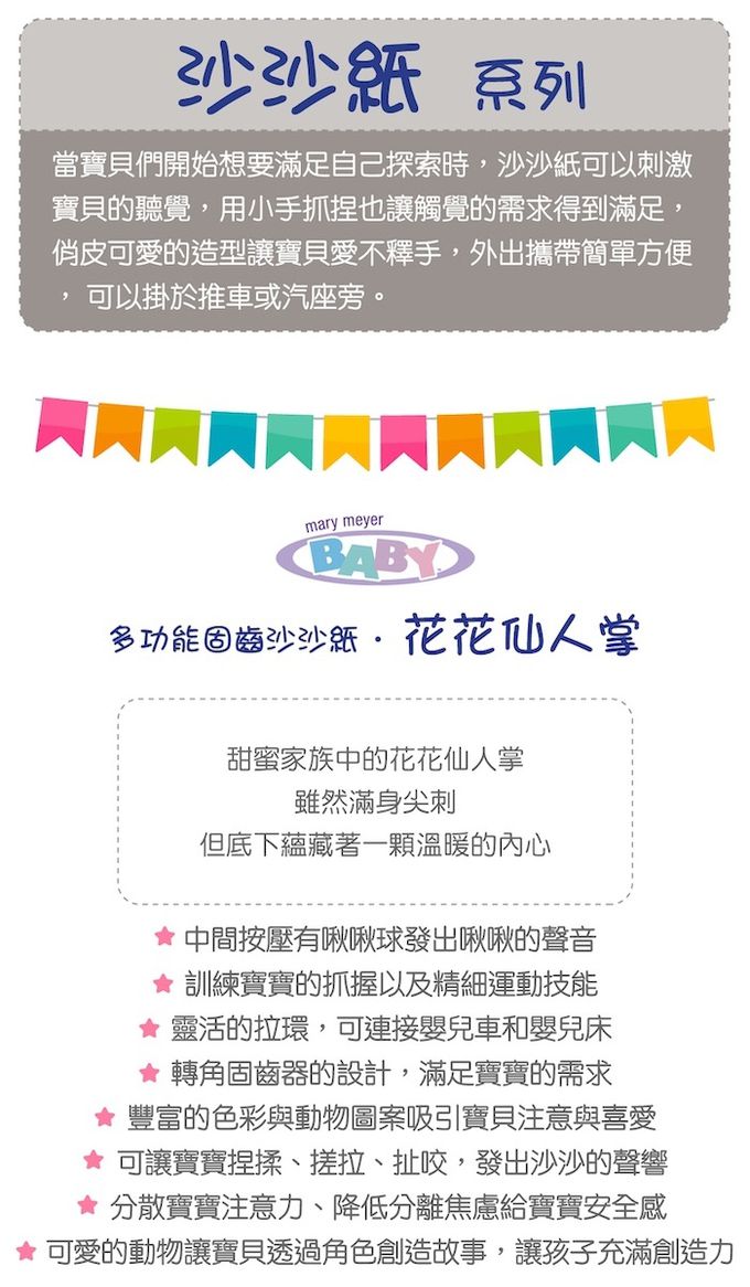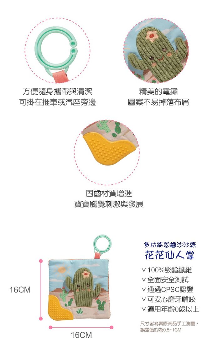 ●甜蜜家族中的花花仙人掌,雖然滿身尖刺,但底下蘊藏著一顆溫暖的內心。●靈活的拉環,可連接嬰兒車和嬰兒床,隨身好攜帶。●有趣可愛的角色圖案,吸引寶寶的好奇與喜愛。●搓揉會有喀擦喀擦的觸感跟聲音,中間按壓有啾啾球發出啾啾的聲音。刺激寶寶的聽力和訓練小手肌肉。●安撫寶寶的情緒。●不含BPA,PVC和鄰苯二甲酸鹽等有害物質。●轉角固齒器的設計,讓口腔期的寶寶可以安心恣意的啃咬,滿足寶寶的需求。