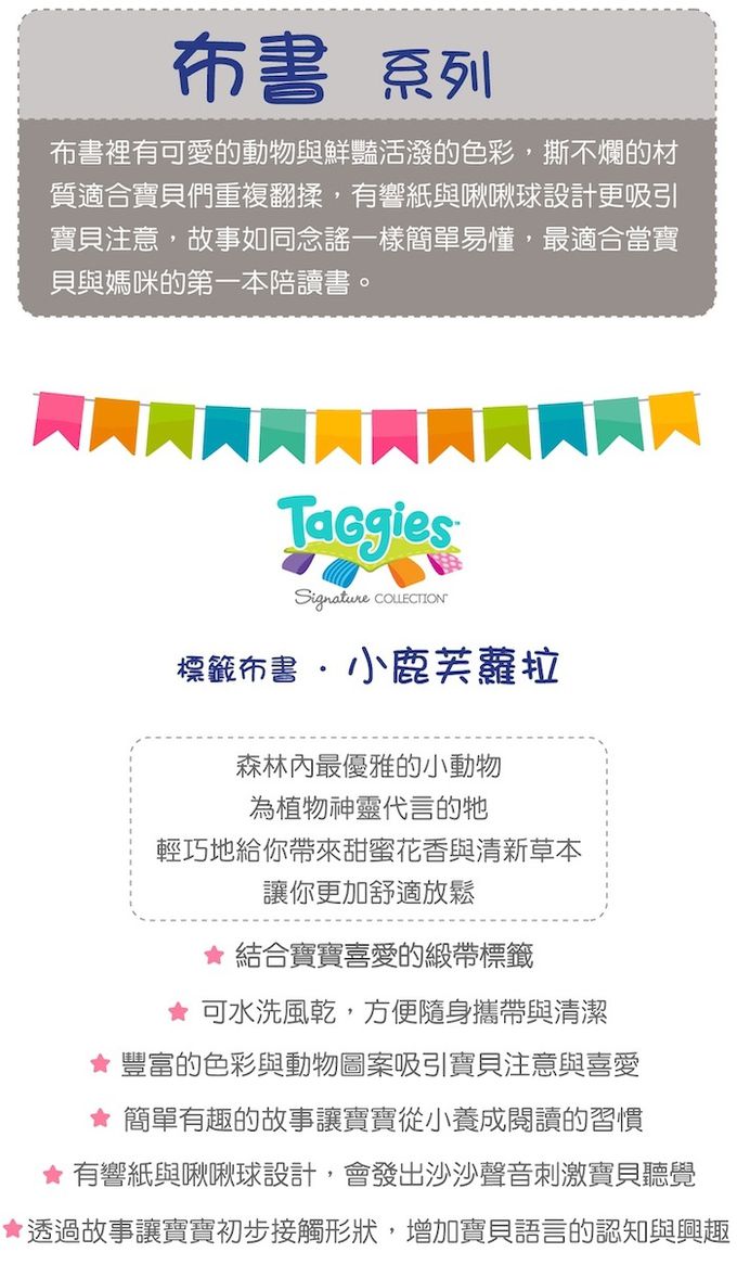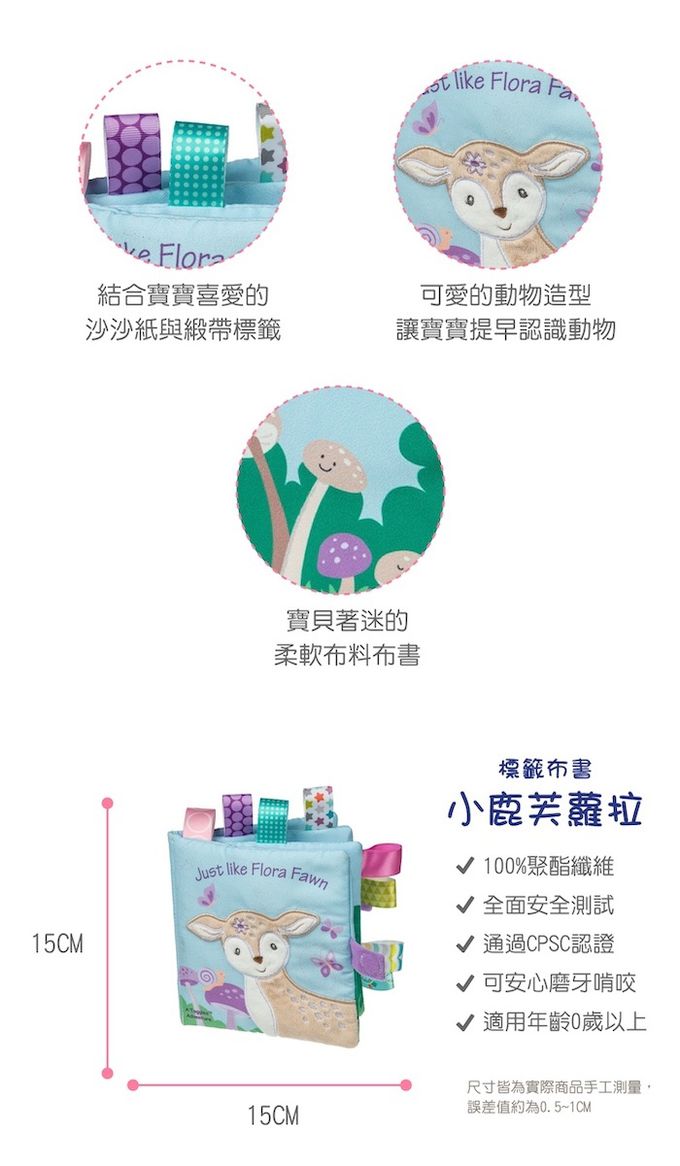 ●小鹿芙蘿拉-超萌的造型,搭配薰衣草與蕨葉的紋理毛絨,絕對是疼愛寶貝們的首選!●全柔軟布料的布書,布料不怕撕破。●為寶寶與媽咪帶來微笑的8頁小故事,從小培養孩子良好閱讀習慣。●結合寶寶喜愛的沙沙紙。●結合寶寶喜愛的緞帶標籤。●吸引寶寶的注意力。