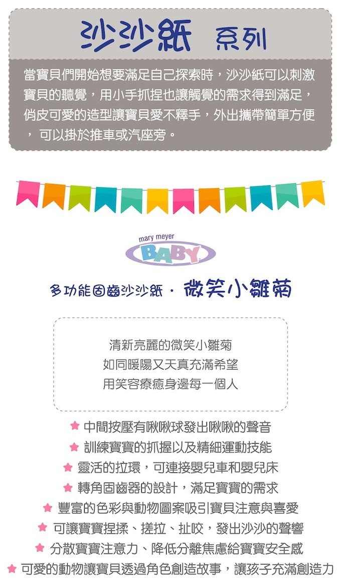 ●清新亮麗的微笑小雛菊,如同暖陽又天真充滿希望,用笑容療癒身邊每一個人。●靈活的拉環,可連接嬰兒車和嬰兒床,隨身好攜帶。●有趣可愛的角色圖案,吸引寶寶的好奇與喜愛。●搓揉會有喀擦喀擦的觸感跟聲音,中間按壓有啾啾球發出啾啾的聲音。刺激寶寶的聽力和訓練小手肌肉。●安撫寶寶的情緒。●不含BPA,PVC和鄰苯二甲酸鹽等有害物質。●轉角固齒器的設計,讓口腔期的寶寶可以安心恣意的啃咬,滿足寶寶的需求。