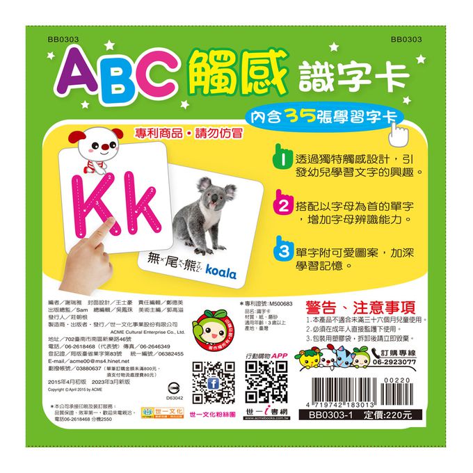 這是一盒讓幼兒透過觸覺記憶學習的字卡,專利設計清晰的筆順加上特殊觸感,讓學齡前的幼兒運用自己的食指,觸覺記憶學習26個英文字母筆順,字體大又清晰, 搭配豐富色彩增加幼兒學習興趣,提高學習專注力.每個字母搭配以26個字母為首的單字,中英文雙語呈現,增加字母辨識能力,並運用精選圖案,延伸學習43組生活常用語詞,豐富幼兒語詞認知經驗.貼心設計輕巧尺寸及四邊圓角保護幼兒,小巧 好用方便攜帶,帶著走真方便,學習起來好放心.