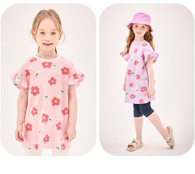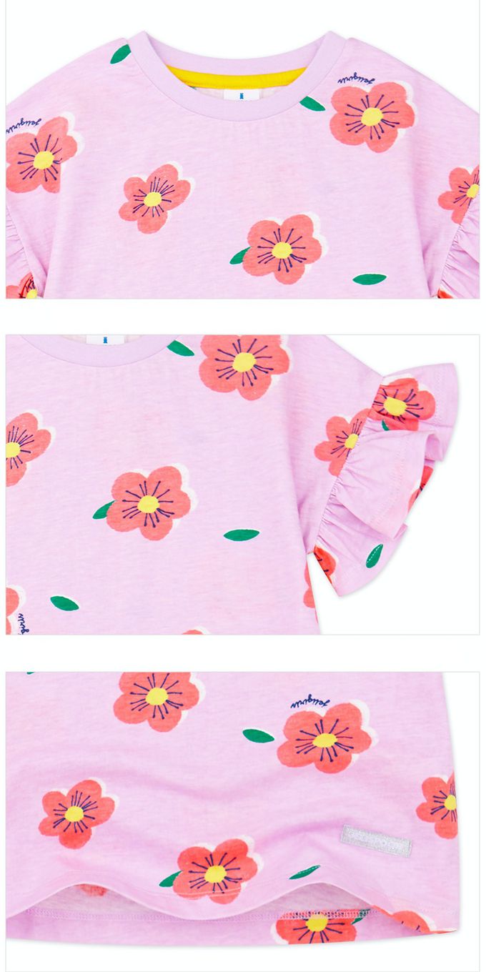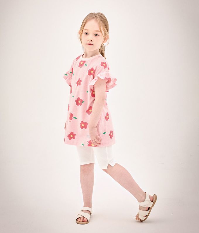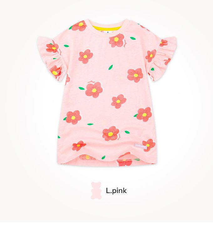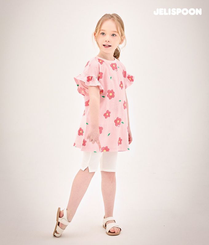 韓國 Jelispoon - 甜美花朵印荷葉袖長版上衣-粉紅