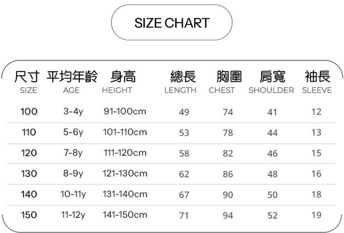 尺寸從90-150公分都有,大小孩和小寶貝都可以穿!