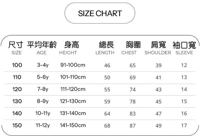 尺寸從90-150公分都有,大小孩和小寶貝都可以穿!