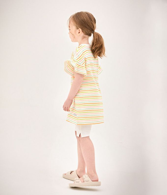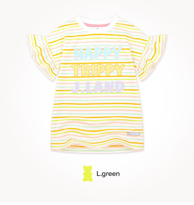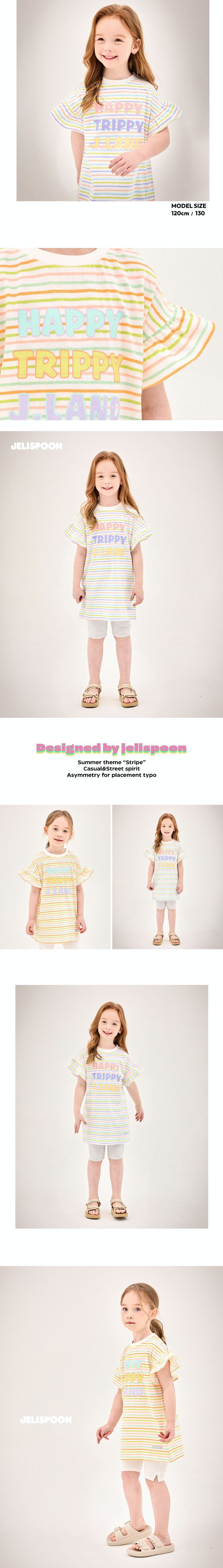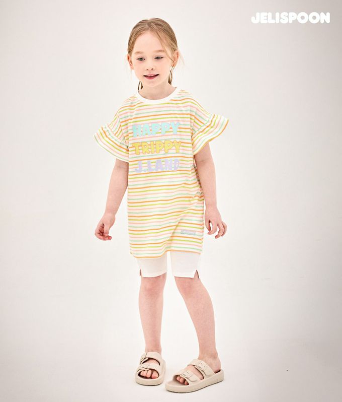 韓國 Jelispoon - 活潑條紋荷葉袖長版上衣-黃綠X橘