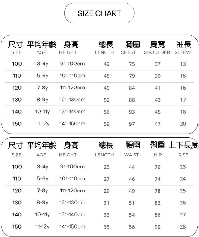 尺寸從90-150公分都有,大小孩和小寶貝都可以穿!