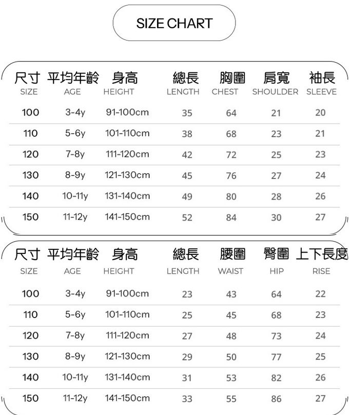 尺寸從90-150公分都有,大小孩和小寶貝都可以穿!