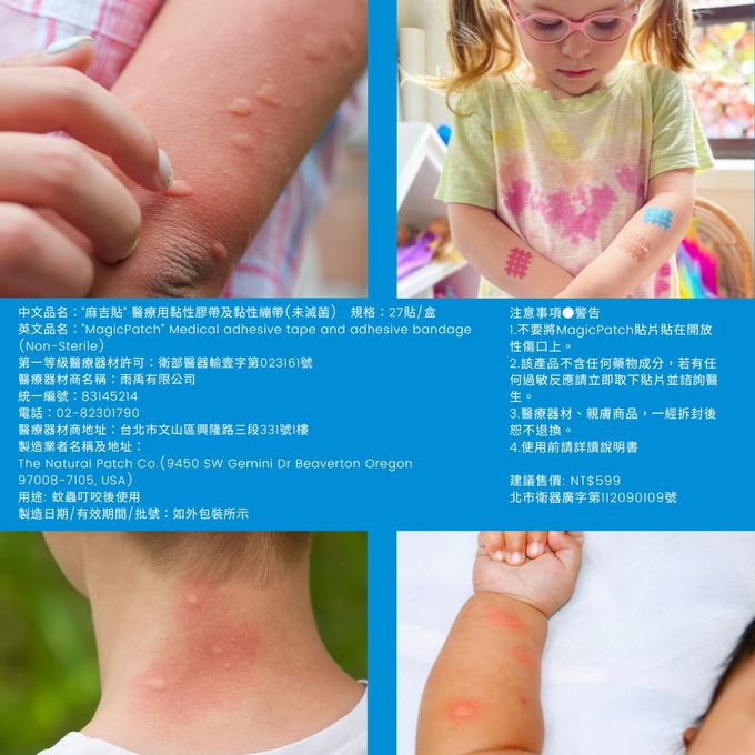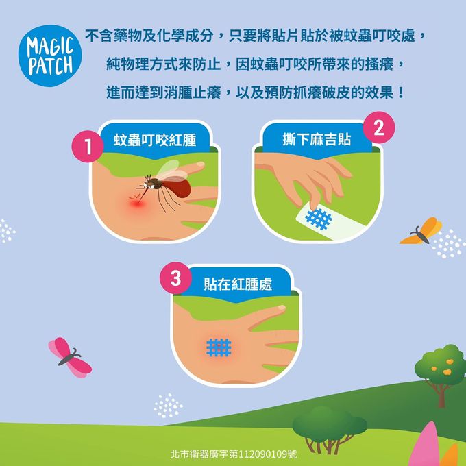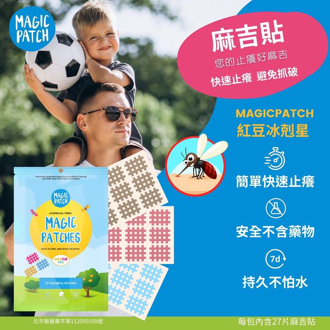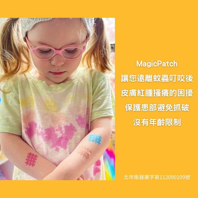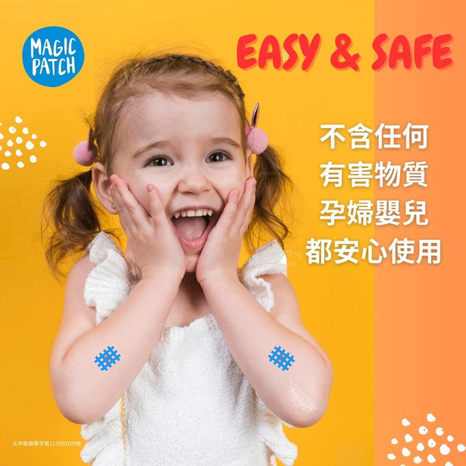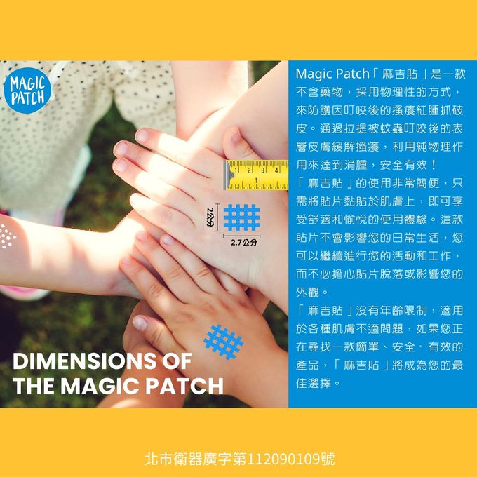 Magic Patch「麻吉貼」是一款不含藥物, 採用物理性的方式,來防護因叮咬後的搔癢紅腫抓破皮。通過拉提被蚊蟲叮咬後的表層皮膚緩解搔癢,利用純物理作用來達到消腫,安全有效!