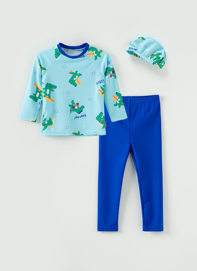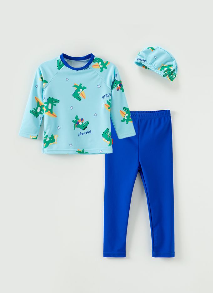 韓國 OZKIZ - 衝浪鱷魚兒童泳裝-三件組-藍